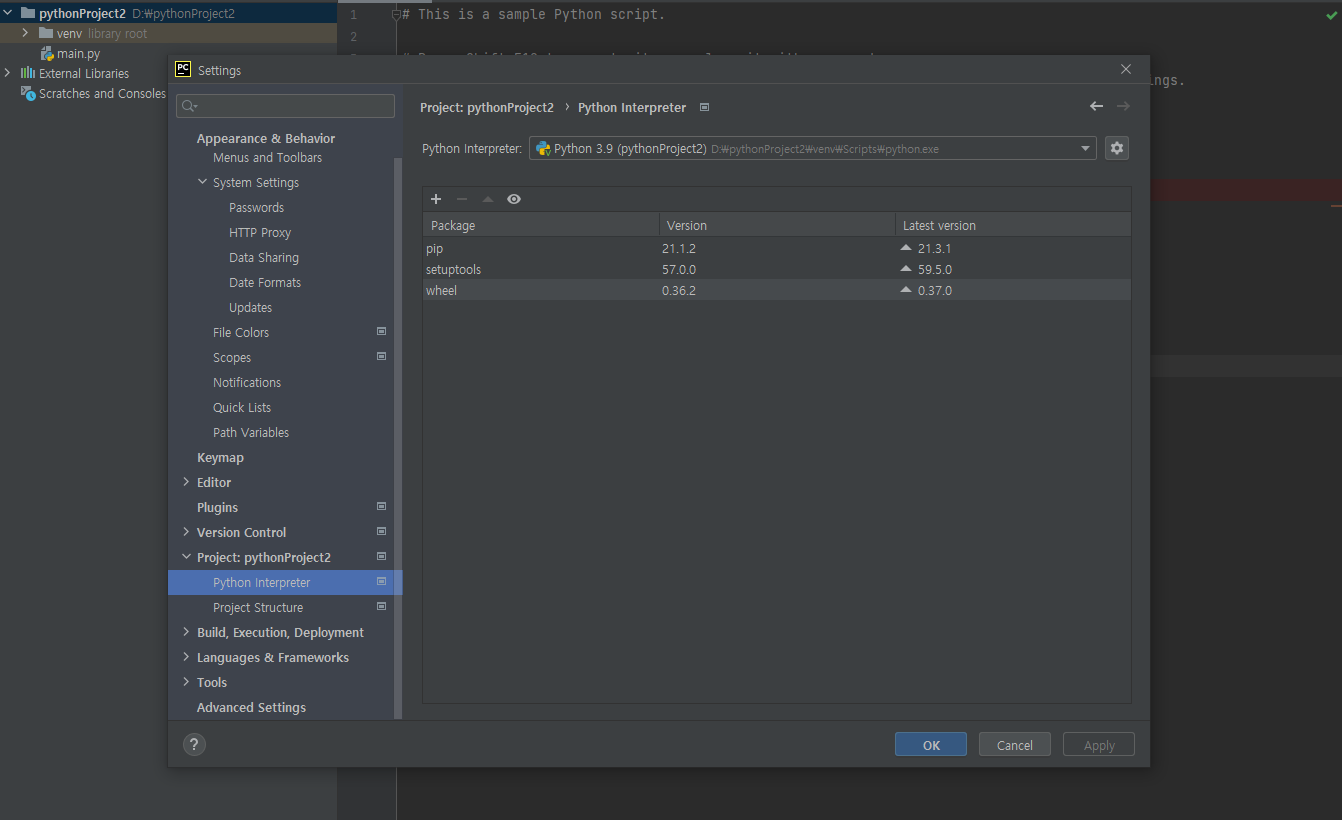 두번째 : File -> Settings -> Project: XXXX 로 적혀있는 부분 클릭 -> Python Interpreter 클릭하면, 아래와 같은 화면이 나옵니다.