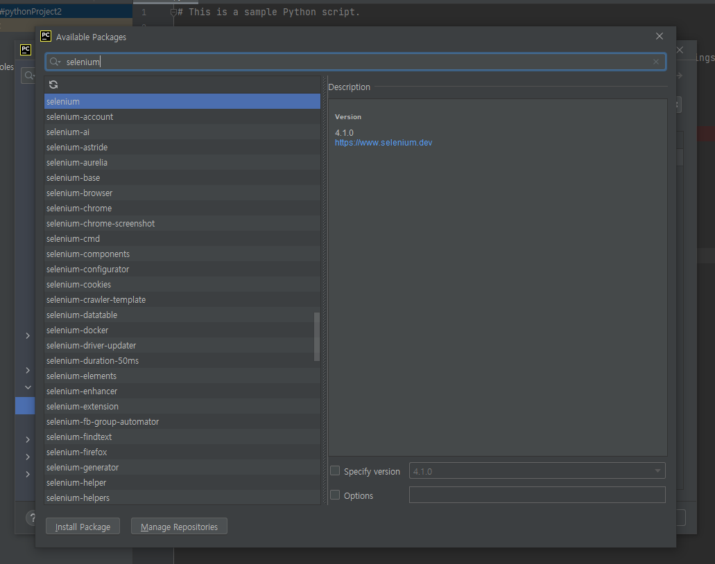 여기서 [+] 버튼 클릭 -> 검색창에 selenium 입력 후 [Install Package] 버튼을 클릭하면 됩니다.