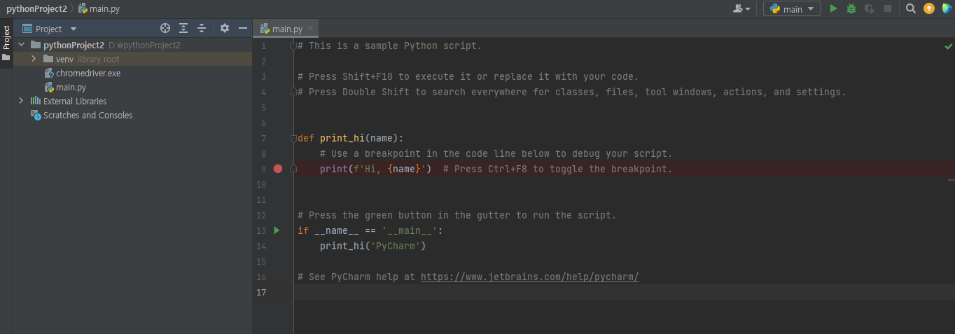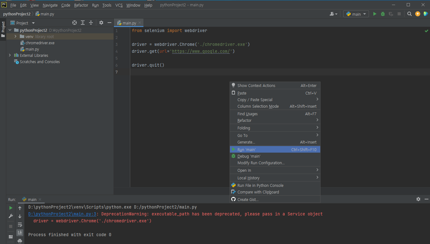 7. 실행을 해보도록 하겠습니다. 실행은 마우스 오른쪽 버튼을 클릭하고, Run 'main' 하시거나 단축키 Control + Shift + F10 을 누르면 크롬 브라우저로 구글 웹페이지가 열렸다가 닫히는 것을 보실 수 있습니다.