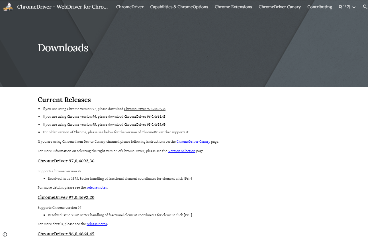 2. ChromeDriver 사이트에 들어가면 Current Releases 에 각종 버전들이 있습니다. 일단 어떤 버전들이 있구나 보시면 됩니다.