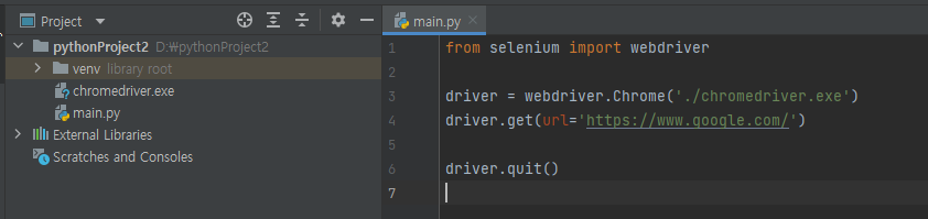 webdirver.Chrome() 함수 내에는 pythonProject2 폴더내에 바로 chromedriver.exe 파일이 위치하기 때문에 ./ 를 사용했습니다.