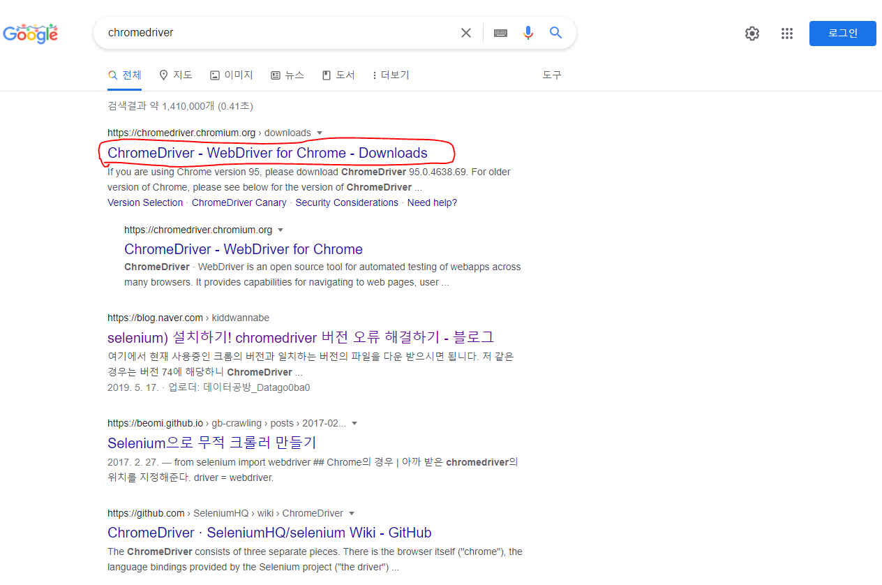 일단 첫번째는 많이들 사용하는 방법으로 chromedriver를 다운 받아서 경로를 지정하여 호출하는 방법입니다.