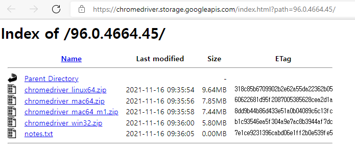 4. 현재 브라우저 버전을 기억하고 ChromeDriver 웹페이지를 보시면 96.04664.45 버전을 볼 수 있습니다. 맨 뒤의 숫자들보다는 맨 앞의 숫자를 맞춰서 다운 받아주시면 됩니다. (예를 들면 내가 현재 96.0.4664.93 버전인데 97.04692.36 버전을 받으면 동작이 제대로 안되는 경우가 발생합니다.)