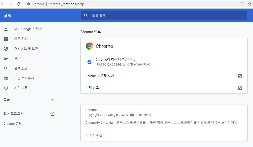 3. 그리고 내가 사용하는 크롬 브라우저를 실행 시키고, 브라우저 창에 chrome://settings/help 를 입력해주면 현재 내가 사용하는 버전을 알 수 있습니다.