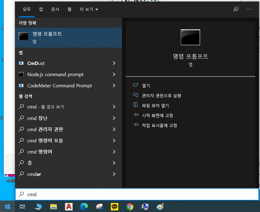 7. 왼쪽 하단의 윈도우 버튼을 클릭하여 cmd 를 입력하여 "명령 프롬프트" 를 클릭합니다.
