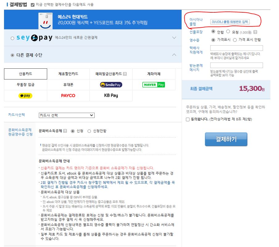 4. 상품을 구매하시고 결제페이지의 결제방법 우측에 보시면 '아시아나 클럽' 메뉴가 있습니다. [아시아나 클럽 회원번호 입력] 버튼을 클릭합니다.