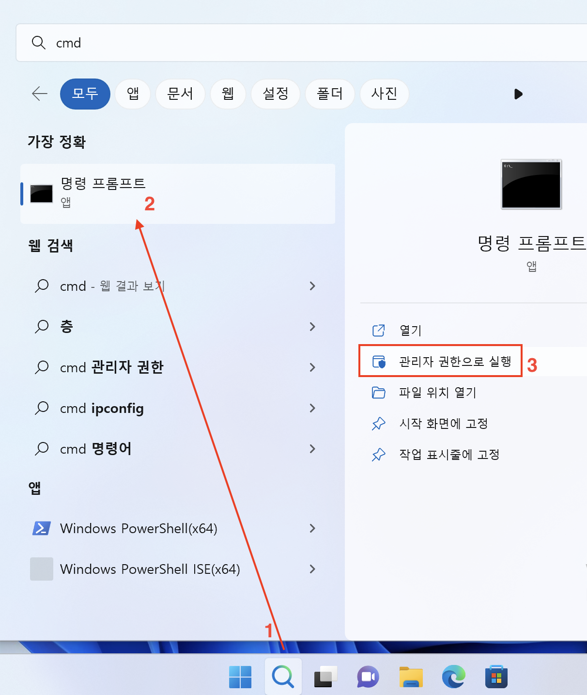 4. 검색 > cmd > 관리자 권한으로 실행 합니다.