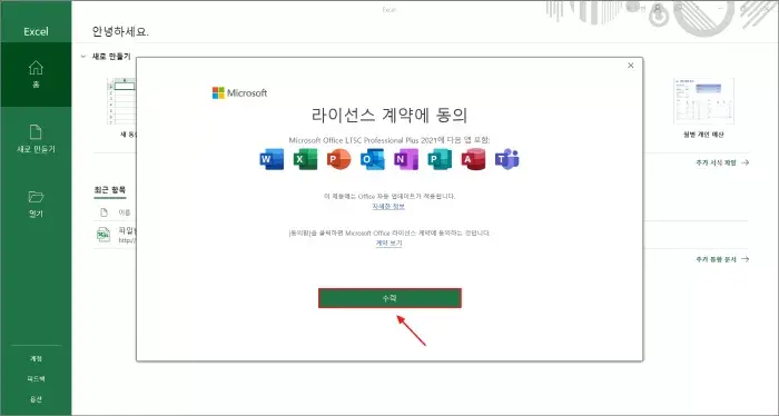6. 위 명령어를 실행한 후 오피스군 아무거나 실행하고 라이선스 계약에 동의 수락합니다.