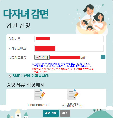 6. 차량번호, 휴대전화번호 입력과 자동차등록증 스캔하여 등록 후 SMS수신에 동의하여 감면 신청합니다.