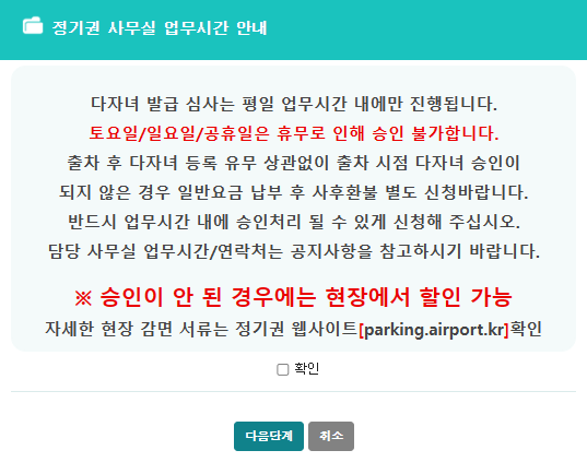 7. 주말 및 공휴일은 휴무로 심사가 안되고, 평일에만 된다는 안내문에 확인 체크를 하고 [다음단계] 버튼을 클릭합니다.