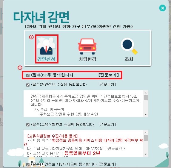 3. '(필수) 모두 동의합니다.' 를 클릭하고 위에 [감면신청]을 클릭합니다.