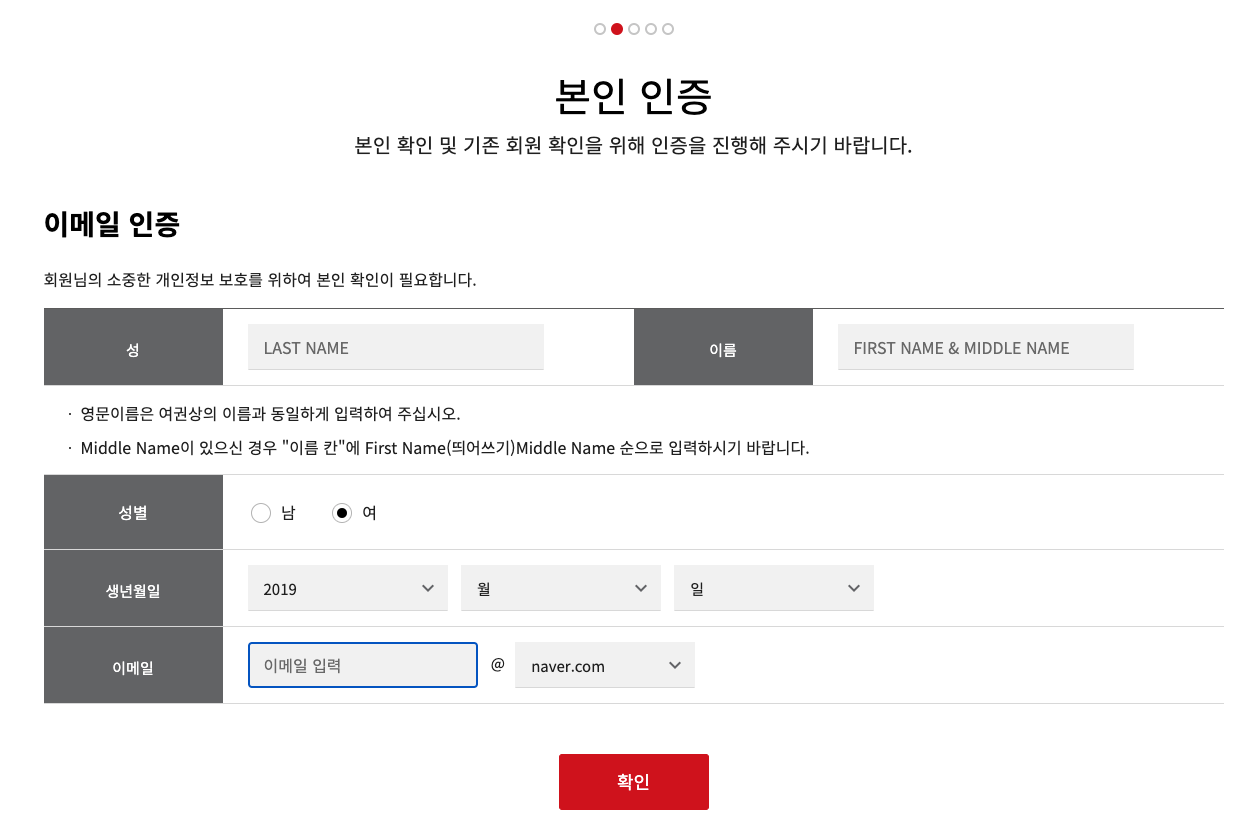 영문 이름은 여권과 동일해야 합니다. (칸 띄움, 대문자 등)