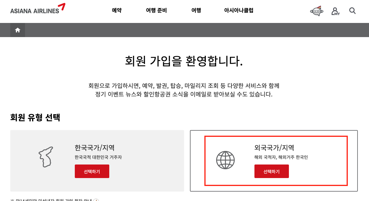 우선 아시아나항공 홈페이지에서 회원가입 란으로 들어가 주세요.