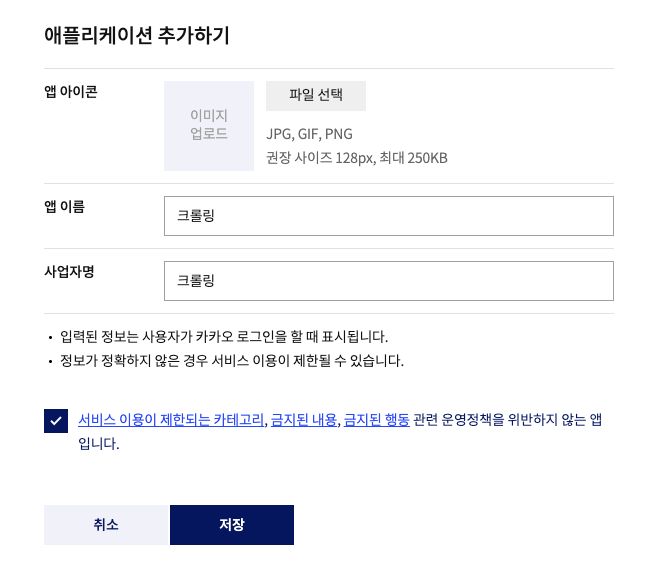 4. '앱 이름' 과 '사업자명' 을 입력하고 서비스 이용 체크 후 [저장] 버튼을 클릭합니다.