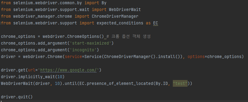 위 예제에서 implicitly_wait(10)을 했는데 10초동안웹페이지가 로딩될때까지 기다리고 10초가 넘어가면 웹페이지가 로딩이 됐던 안됐던 다음 명령어를 실행하겠다는 뜻입니다.이 또한 상황에 적정한 시간을 설정하면 됩니다.